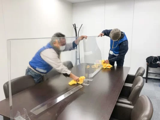 施工場所:会議室(横浜市) 施工箇所:壁、テーブル、いす、パーテーション、トイレ 人が集まる会議室の除菌・抗菌対策をしたいというご要望をいただき、横浜市の事業所を光触媒ALL CLEAR Zで施工しました。
