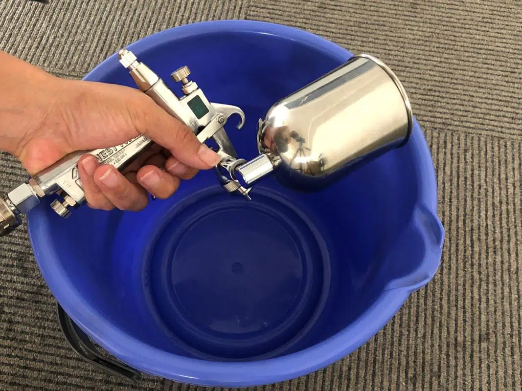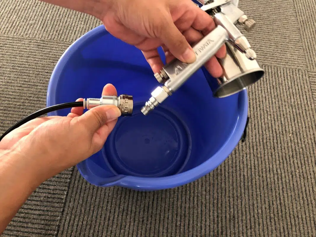 次にバケツの水の中にスプレーガンを入れて、数秒間噴射し、スプレーガンの内部を洗浄します。