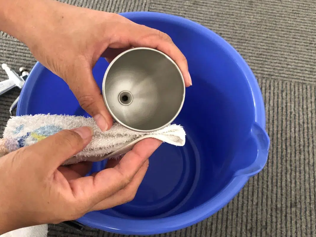 スプレーガンから液体カップを取り外し、水を張ったバケツの中で液体カップを洗浄します。
