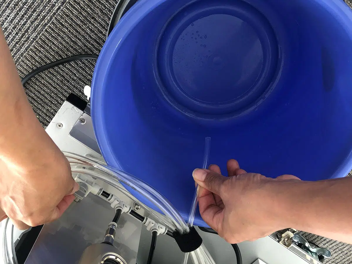 ドレンチューブからコンプレッサー内の水が空気とともに排出されます。用意したバケツに水を受けたらそのまま水道に流してください。
