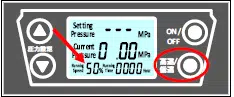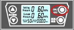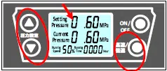 動作中に圧⼒設定ボタン▲または▼を押し、タンク内圧⼒を「0.60MPa」に設定します。タンク内圧力の設定値はパネル内の「Setting Pressure」に表⽰されます。