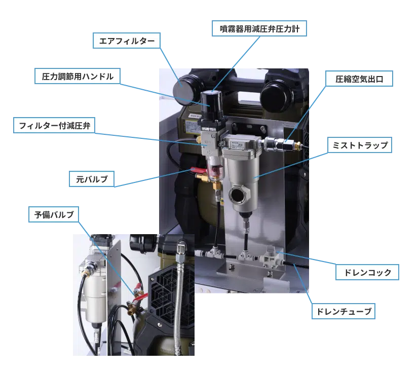 噴霧用減圧弁圧⼒計で0.3MPa程度になるようにハンドルを回します。